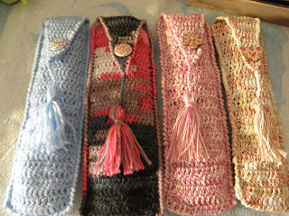 SON DE GANCHILLO, CON HILO O LANA, Y ESTAN HECHAS CON PUNTO ALTO, QUE ES MUY AGRADECIDO. LLEVAN UN CIERRE DE IMAN, Y A ALGUNOS LES HE PUESTO UNA BORLA, Y A OTROS UN BOTON FORRADO, QUE HAGO CON MI MAQUINA DE FORRAR BOTONES QUE ME COMPRE DE SEGUNDA MANO.... JEJEJEJEJ.