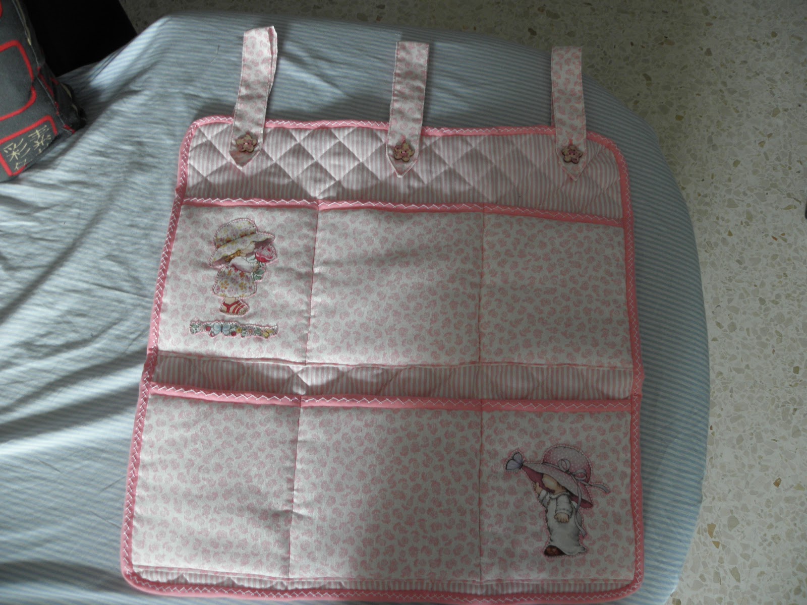 ESTA TODO HECHO A JUEGO, EN TELITAS DE TONOS ROSA, ENTRE LUNARES Y RALLAS....MENOS EL NECESER, QUE LLEVA OTRA, Y QUE ADEMAS ESTA PLASTIFICADO....LA BOQUILLA, ERA GRANDISIMA, Y SE ENCARGO DE REGALARMELA UNA COMPI BLOGUERA DE EL PRAT DE LLOBREGAT, ROSARIO....EN CUANTO SE ENTERO DE LA NOTICIA, ME LA MANDO PARA QUE ME PUSIERA MANOS A LA OBRA.